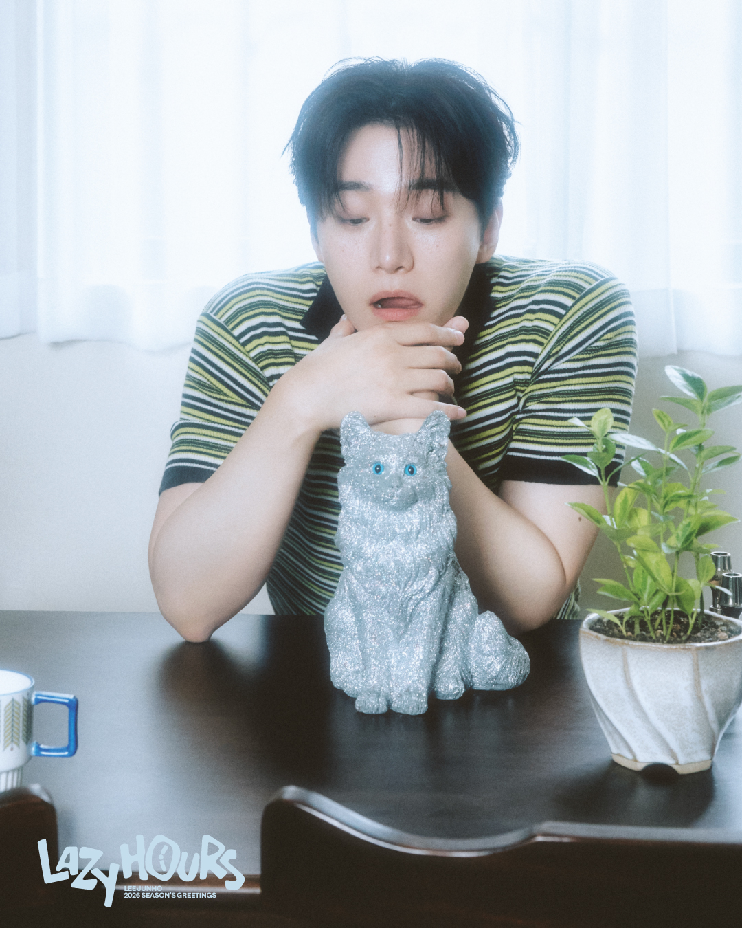 Intitulé “LAZY HOURS”, ce nouveau projet met en scène Junho dans une atmosphère cosy et décontractée, comme s’il nous invitait à partager avec lui un moment de pause hors du temps. Installé dans un intérieur vintage aux tons doux, vêtements casual, regard rêveur, téléphone rétro à la main… il incarne avec naturel le charme d’une journée sans obligations.
